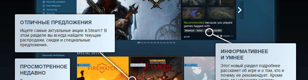 На главной странице появилось много новых разделов – она просто пестрит списками, рекомендациями и скидками. И даже если ваша игра показывается в одном из этих списков, надо понимать, что рядом с ней всегда ещё десятки баннеров.