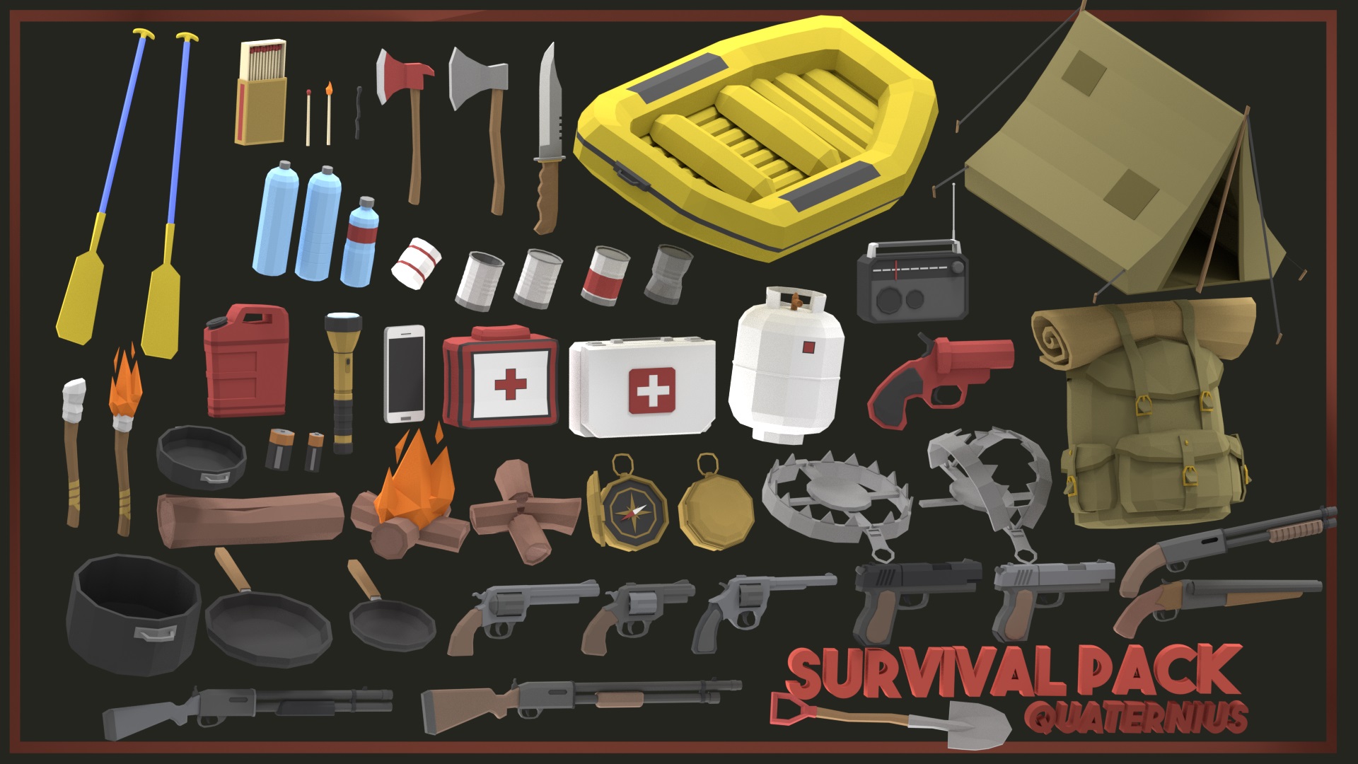 Набор из 53 моделей вещей, которые пригодятся для разбивки лагеря в дикой природе: палатка, лодка, питьевая вода и провиант, средства для розжига огня, капканы, огнестрельное оружие, нож, топоры и т.д. Модели не имеют анимаций и текстур (цвет задан в материале)