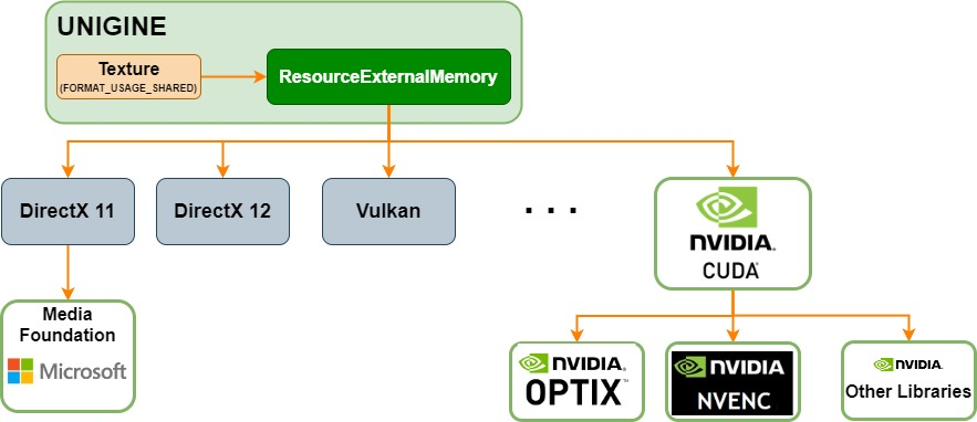 Unigine Sim SDK теперь включает новый набор примеров, демонстрирующих, как взаимодействовать с внешним графическим API с использованием новых классов ResourceExternalMemory и ResourceFence в Unigine API). В примерах показано взаимодействие с NVIDIA CUDA Toolkit, но вы можете использовать их в качестве основы для интеграции графических API Движка (Vulkan, DX11, DX12) с другими графическими API (OpenGL, DX, CUDA и т.д.), которые могут принимать дескриптор и импортировать примитив синхронизации (например, внешний семафор в CUDA).