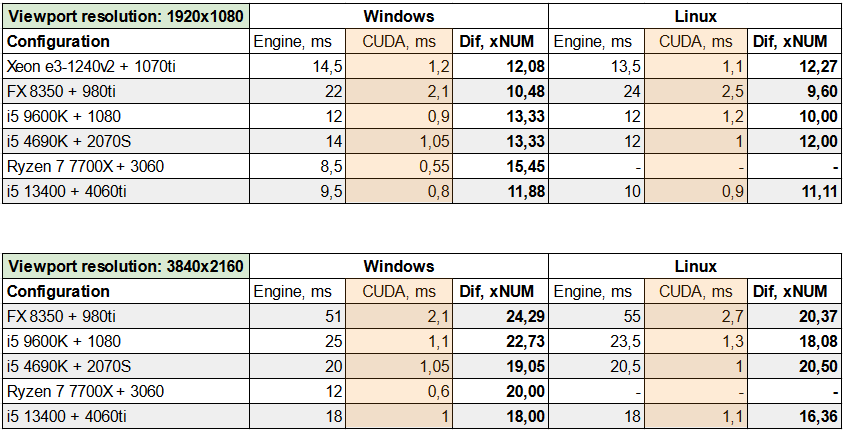 Разница в производительности передачи текстур GPU -> CPU , выполняемой через CUDA 12.3 и средствами движка, показана в таблице ниже (проверено на наших рабочих конфигурациях). Средний прирост производительности с CUDA составил х10 до х24 в зависимости от разрешения окна.