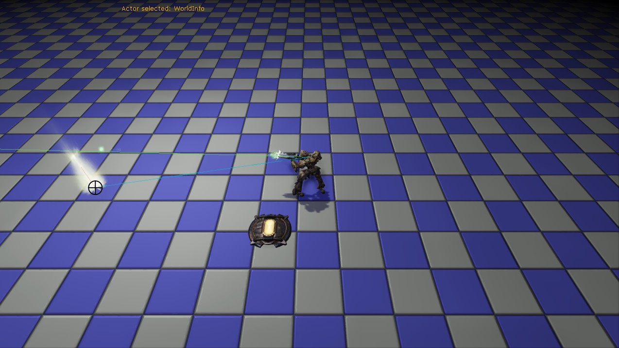 Во время создания скрипта (ну как скрипта, в этом, казалось бы, простом процессе, задействовано 5 скриптов) возникла одна большая проблема. Дело в том, что для поворота персонажа к курсору используется преобразование положения курсора на экране в положение курсора в мире. И все бы прекрасно, вот только по логике движка, в игровом мире курсор лежит на земле. Персонаж повернут к курсору, но, если смотреть прямо сбоку, стреляет он выше него. В итоге, получалось неслабое отклонение линии огня от реального положения курсора. Чтобы вы поняли, о чем я, см. картинку ниже.