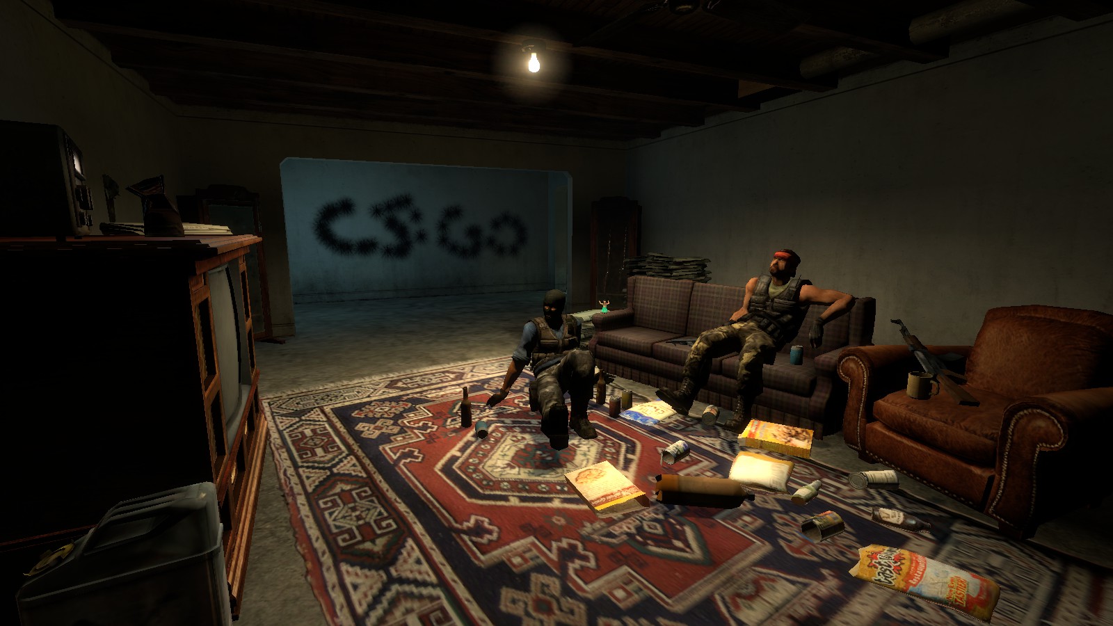 Два террориста захватив чей-то дом уже неплохо устроились! Нашли холодильник, телевизор и старый диван. Пива тут хоть отбавляй, но кажется один из них уже неплохо надрался...