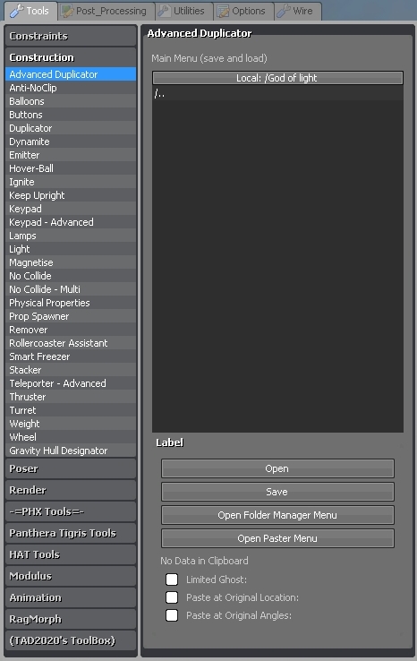 Advanced Duplicator - крайне полезный инструмент, позволяет копировать созданные вами гениальные изобретения и вставлять в указанных местах. Кроме того, обладает функцией запоминания - сохранения ваших работ в папке в формате txt, при этом в любой новой игре вы можете, смело воспользовавшись этим инструментом, сразу воссоздать ранее сохраненные вами поделки.