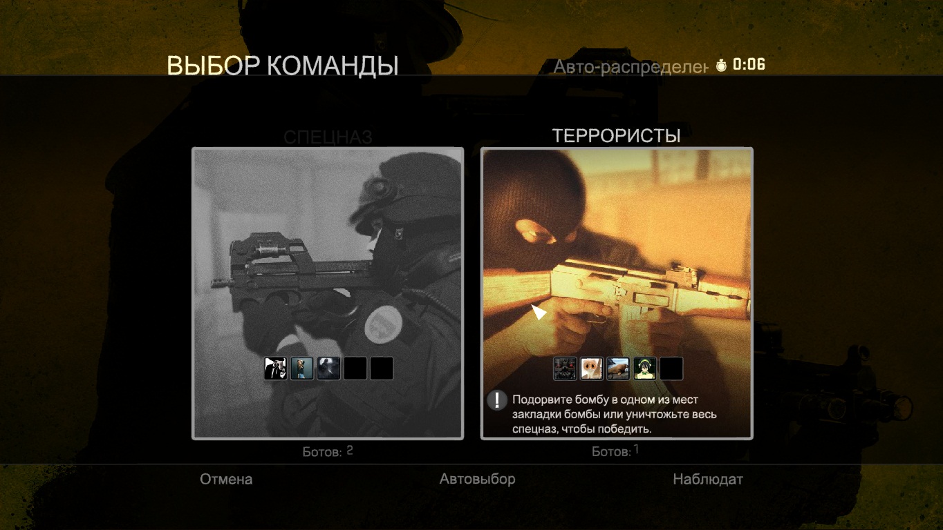 Когда я подключился к игре, мне вполне ожидаемо предложили выбрать команду, в которой я хочу играть. Видимо, чтобы я не слишком долго думал, в углу экрана висит таймер автораспределения, который по истечении времени кидает в команду с наименьшим количеством игроков или, при равном составе, с наименьшим количеством очков.