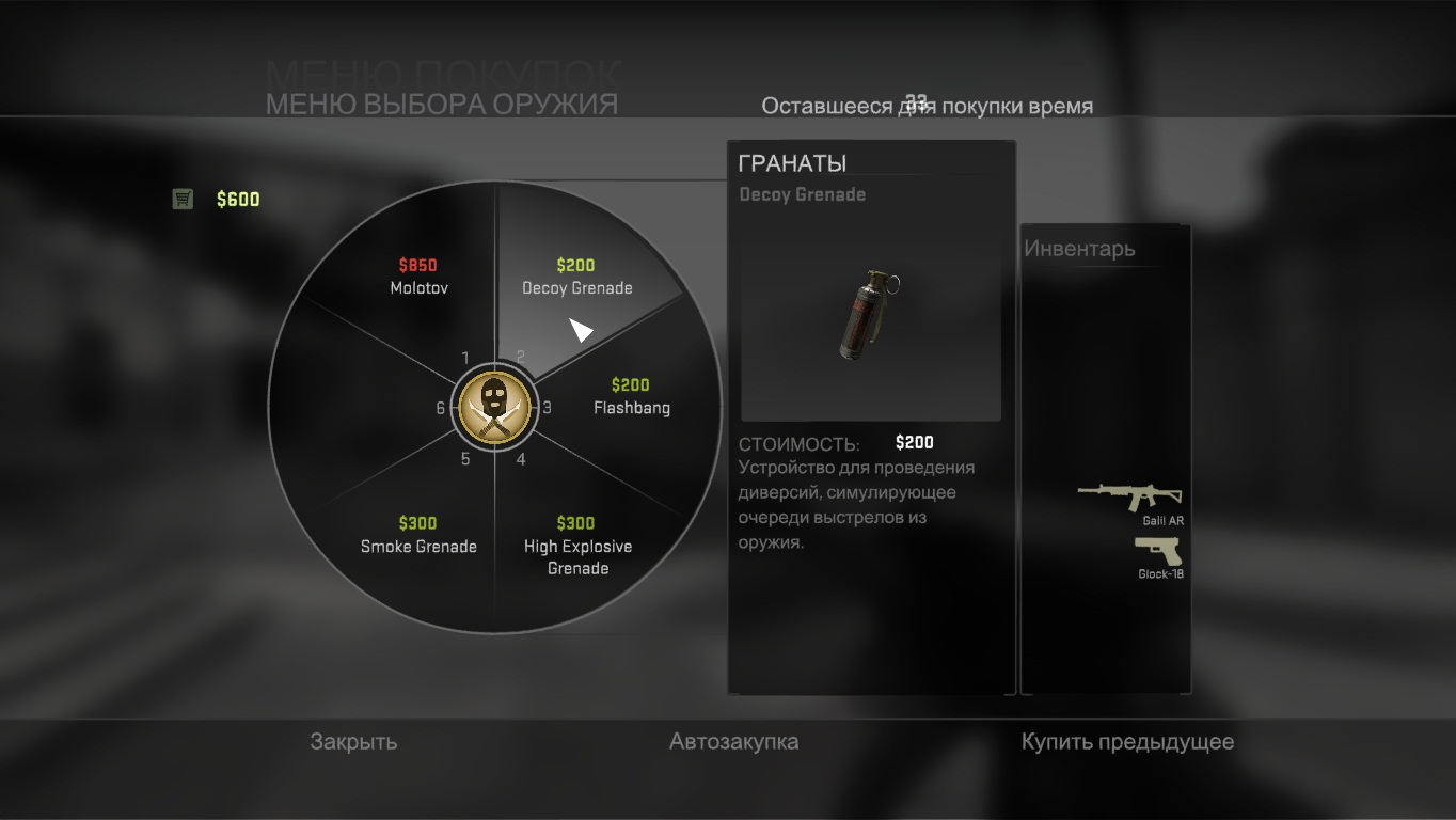 В меню с гранатами появилось два новых предмета - Decoy Granade и Molotov (у спецназа он называется как то по-другому, но суть остаётся та же). Decoy Granade позволяет где нибудь за спинами противника создать эдакую обманку - она издаёт звуки, похожие на стрельбу. Молотов же создаёт огненный заслон, который снимает по 5 здоровья каждые 0.5 секунды всем, кто в этот заслон зашёл и, вдобавок, неплохо замедляет.