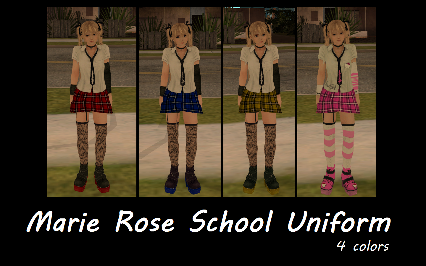 Мод, добавляющий в GTA San Andreas нового персонажа - Мэри Роуз, девушку из серии файтингов Dead or Alive, на этот раз - в школьной форме. Доступны 4 варианта цвета юбки и ботинок - красный, синий, желтый и розовый.