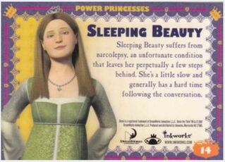 Sleeping Beauty is one of Princess Fiona's friends. She suffers from intense narcolepsy, constantly sleeping at random moments, and sometimes while standing.