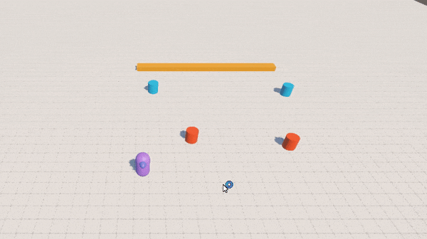 Для реализации этих механик я собрал в Unity простенькую сцену из источника света и белой плоскости, на которой расположил Героя (фиолетовая капсула), Противников (красные цилиндры), Здания (светло-голубые цилиндры), Границу (оранжевый параллелепипед).