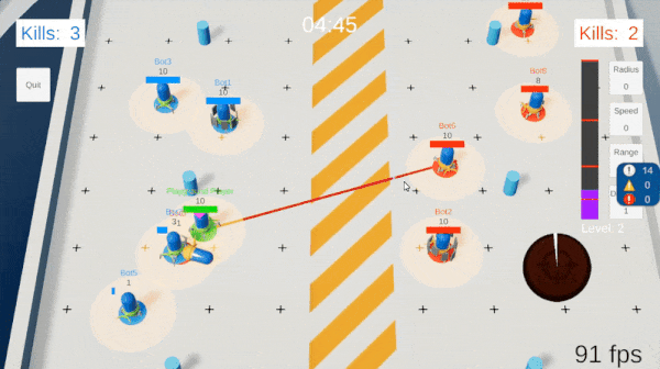 Также, ещё раз решили протестировать вариант управления пальцем. Если противники находятся сверху, то как я ранее писал - правым пальцем неудобно тянуться в левый дальний угол. Поэтому, чтобы протестировать как играется, с противниками большую часть времени находящимися рядом с правым пальцем, арена повернулась на 90 градусов (на -90, если уж совсем занудствовать).