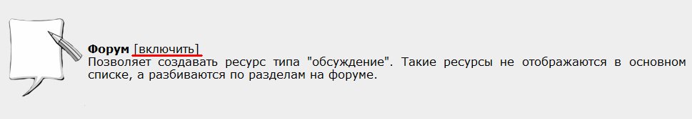 - Форум - Позволяет создавать ресурс типа "обсуждение". Такие ресурсы не отображаются в основном списке, а разбиваются по разделам на форуме. Модуль изначально выключен.