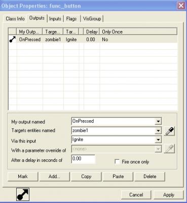 Теперь вам нужно выбрать кисть (brush) размером модели вашей кнопки, и поместить его внутрь этой модели. Установите ей полупрозрачную текстуру, преобразуйте кисть в entity и задайте ей класс function _button. Затем зайдите во вкладку Outputs и нажмите add.