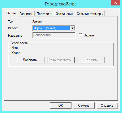 Здесь мы можем указать название города, а так же поставить в город героя, которого тоже можно отредактировать.