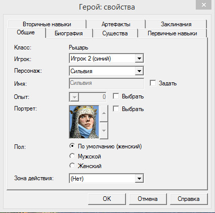 Здесь мы редактируем имя, портрет, кол-во опыта, пол и зону дествия героя(ограничение действий героя.Мы можем заставить героя постоянно стоять на месте или патрулировать определённую область от 1 до 10 квадратов).