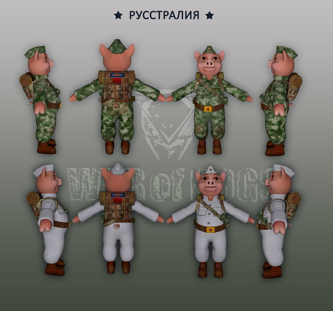 Вы можете выбрать одну из пяти наций: Америку, Россию, Францию, Японию, Германию. К каждой нации относиться свой цвет и определенный стиль формы. При создании своей команды Вы можете изменить её название, имена каждого свина, а так же подобрать себе подходящий цвет команды.