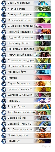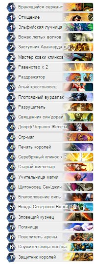 Карты, которые очень приятно удивили меня, но всё-таки были на уровень пониже предыдущих: железноклюв - несмотря на 2 хранителей чащи, этот парень смог затащить аж 2 целых игры, убрав таунты со стола противников. Считается, что карта средняя, но мне она очень сильно помогла, так что подумайте ещё раз, прежде чем её не брать. Разъярённый ворген - возможно, мне немного везло, что они могли ударить 2 раза за бой, хотя это и вина противников. Эти парни (у меня было двое) хорошо комбинируют со знаком и силой дикой природы. Поганище - вообще, я полностью не доверяю этой карте, и даже не люблю её, но она невероятно круто показала себя в этих партиях. Также помогла затащить в финальной игре, где всё-таки маг совершил грубую ошибку, которая определила его исход. Тигр Тернистой долины - обычный тигр, но имеет хорошие характеристики и очень необходимую маскировку. В моих играх он сыграл получше, чем обычно, и также затащил парочку. Верховный маг - этот мертвец вызывает у меня большие сомнения, т.к. имеет довольно низкую атаку, а урон от заклинаний обычно не сильно необходим. Но тут даже его малая атака смогла затащить игры, а урон от заклинаний помог разобраться с водяным элементалем при помощи звёздного огня в финальной игре.