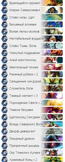 Следующие карты показали себя обычно, ничем не выделились в этих играх, но при этом всегда имеют высокую оценку. Пренебрегать ими нельзя, эти карты могут быть даже лучше, что вверху: знак дикой природы (благодаря комбы с воргенами, а также с провидцом Траллмара), молодой хмелевар (мог возвращать пару полезных существ), воин синежабрых,чокнутый подрывник (знал, куда стрелять, но не идеально), чудесный дракончик, владычица бесов, священник син'дорай, служитель Земли (странно, что Земля с большой буквы, мы вроде на другой планете), морозный йети, страж луносвета (тоже по большему счёту благодаря знаку и силе дикой природы), щитоносец Сенд'жин (всегда хорош), рыцарь Длани, звёздный огонь, огр тяжёлого кулака, древо мудрости.
