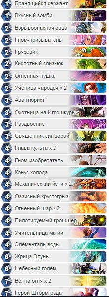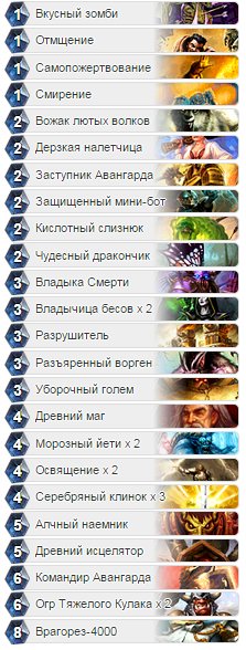 Карты, которые очень приятно удивили меня, но всё-таки были на уровень пониже предыдущих: железноклюв - несмотря на 2 хранителей чащи, этот парень смог затащить аж 2 целых игры, убрав таунты со стола противников. Считается, что карта средняя, но мне она очень сильно помогла, так что подумайте ещё раз, прежде чем её не брать. Разъярённый ворген - возможно, мне немного везло, что они могли ударить 2 раза за бой, хотя это и вина противников. Эти парни (у меня было двое) хорошо комбинируют со знаком и силой дикой природы. Поганище - вообще, я полностью не доверяю этой карте, и даже не люблю её, но она невероятно круто показала себя в этих партиях. Также помогла затащить в финальной игре, где всё-таки маг совершил грубую ошибку, которая определила его исход. Тигр Тернистой долины - обычный тигр, но имеет хорошие характеристики и очень необходимую маскировку. В моих играх он сыграл получше, чем обычно, и также затащил парочку. Верховный маг - этот мертвец вызывает у меня большие сомнения, т.к. имеет довольно низкую атаку, а урон от заклинаний обычно не сильно необходим. Но тут даже его малая атака смогла затащить игры, а урон от заклинаний помог разобраться с водяным элементалем при помощи звёздного огня в финальной игре.
