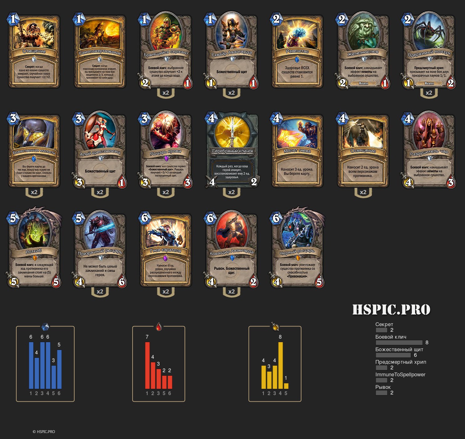 Дека рассчитана на ранний контроль стола с впечатляющим мид-геймом. Очень сильные начальные миньоны вкупе с классовой способностью Паладина и парой секретов заставят дрогнуть практически любого противника. В начале игры у Вас будет очень много карт на выбор, поэтому Вы не будете пропускать ходы как это делает Контроль паладин. Вы также сможете не боятся и массовых ремувалов (как это боится аггро-паладины, например или любая аггро-дека) и выгодно размениваться с начальными миньонами соперника. О возможных комбо будет расписано ниже. А пока давайте разберем каждую карту, играющую в деке.