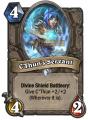 - Боевой клич срабатывает до того, как существо помещается на доску, поэтому аурные эффекты типа Тотем языка пламени/Лидер рейда не усилят боевой клич К'Туна.