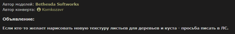 Если кто-то желает нарисовать новую текстуру листьев для деревьев и куста - просьба писать в ЛС.