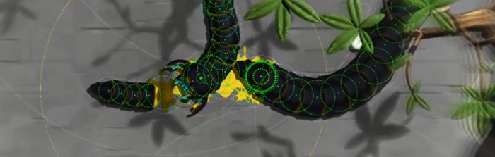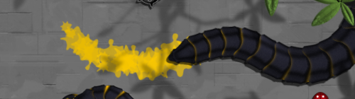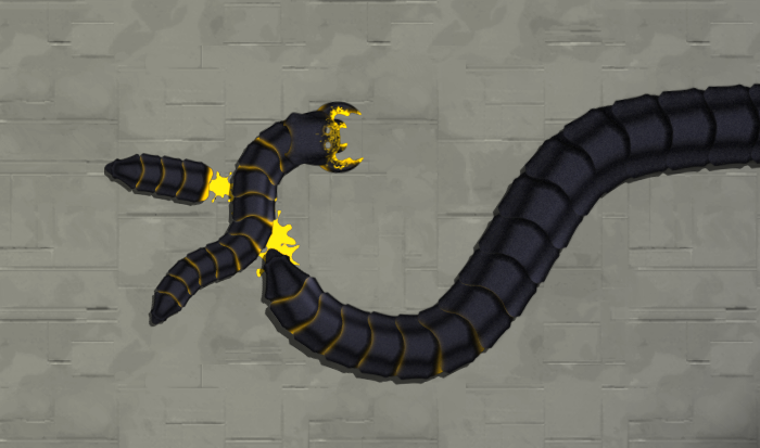 Ещё молодые черви отличаются от старых. Сейчас раскраска моя тестовая, на ней молодые черви более желтые и полосатые, а взрослые сплошняком чёрные. Для каждой части червя есть две картинки, которые при отрисовки блендятся друг с другом в зависимости от размера части червя. Поэтому хвост червя немного "моложе", чем он сам.