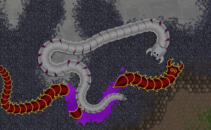 Ещё молодые черви отличаются от старых. Сейчас раскраска моя тестовая, на ней молодые черви более желтые и полосатые, а взрослые сплошняком чёрные. Для каждой части червя есть две картинки, которые при отрисовки блендятся друг с другом в зависимости от размера части червя. Поэтому хвост червя немного "моложе", чем он сам.