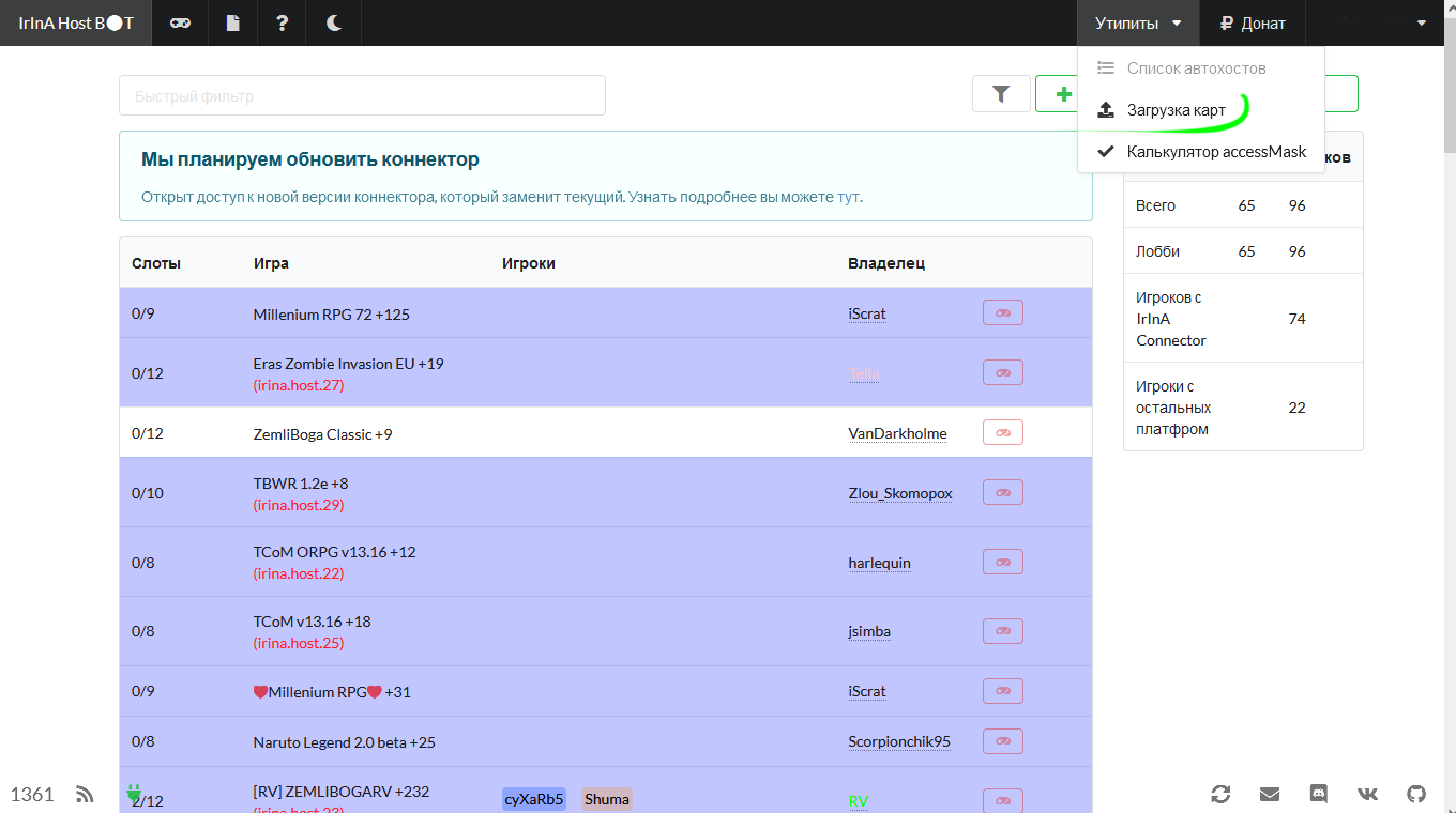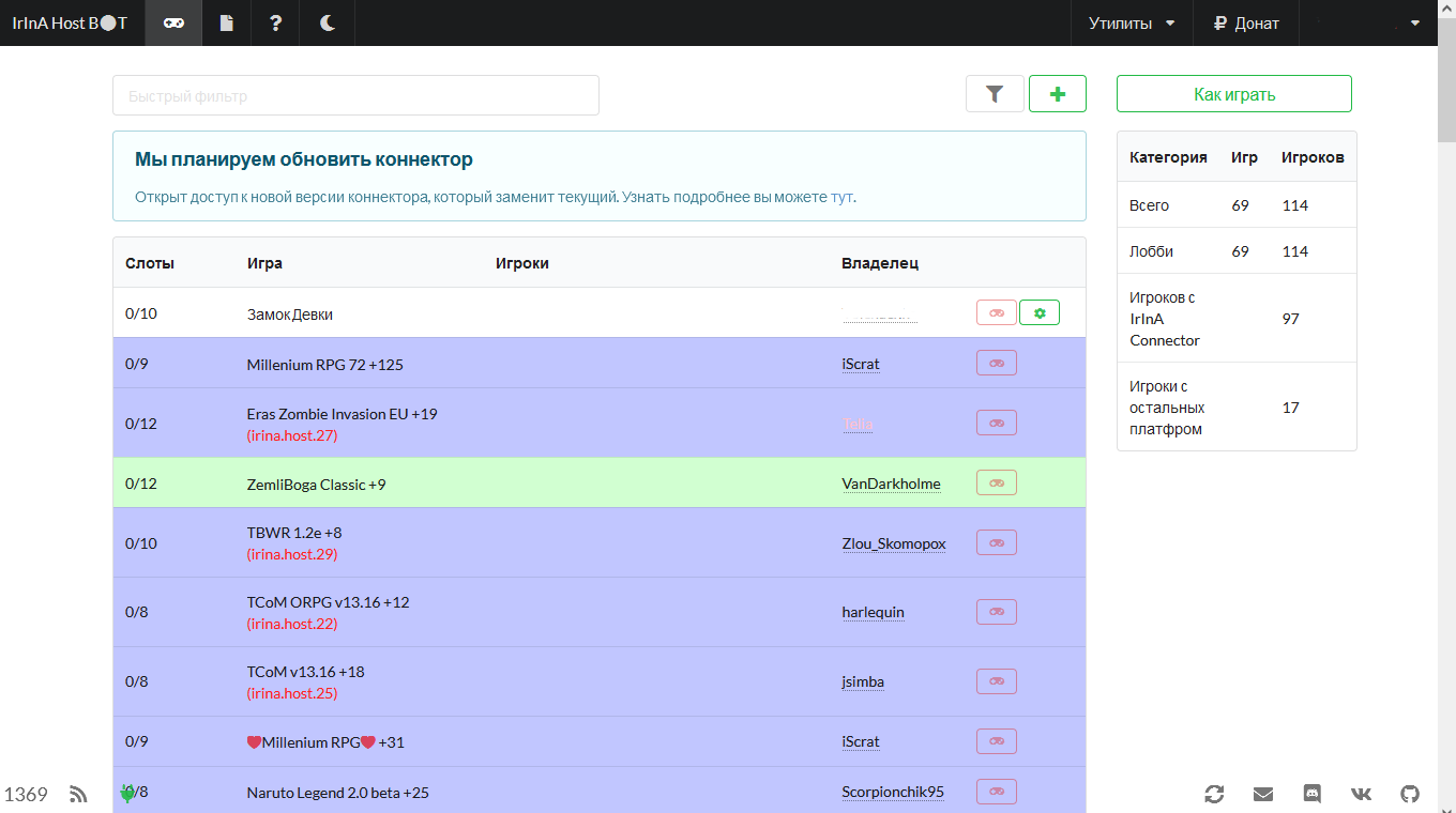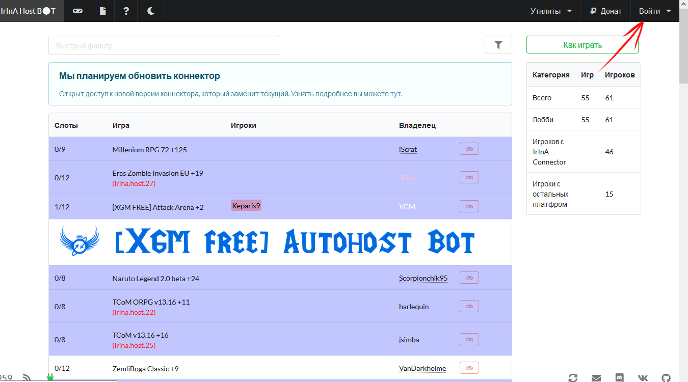 Чтобы создать игру, вам, в первую очередь надо зарегистрироваться на сайте IrInA Bot. Регистрация проходит входом на сайт через VK или Discord