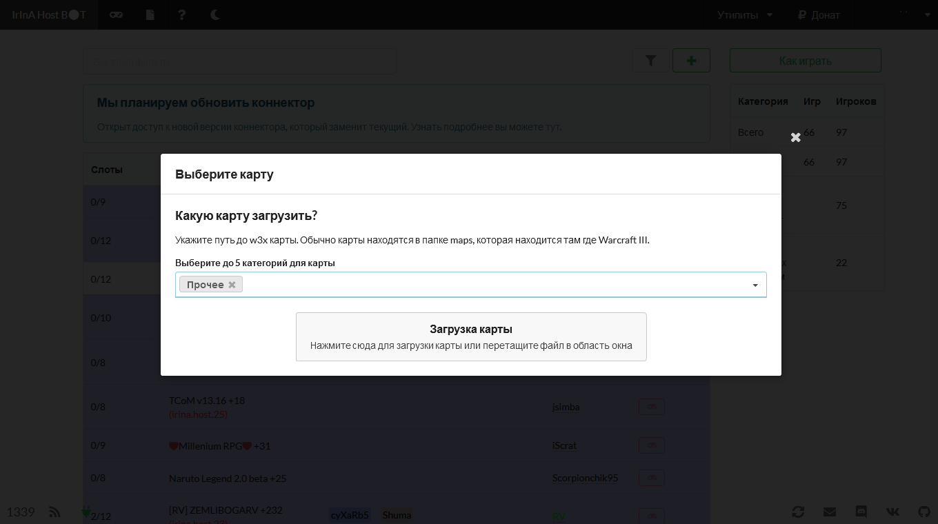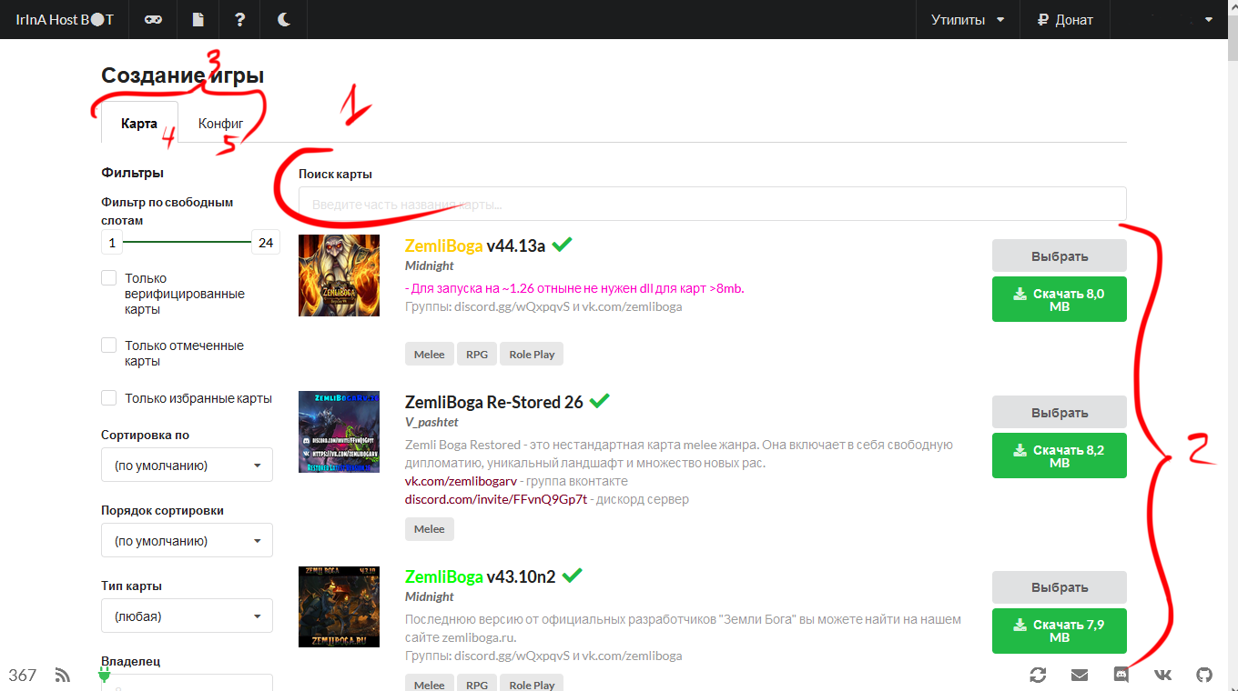 - Остаётся только выбрать нужную карту для создания игры, поэтому нажимаем на кнопку выбрать в списке карты, на соответствующей её колонке (пометка 2)