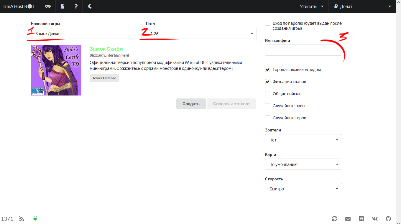 Как откроется страница создания игры, то введите вам нужные параметры для создания игры.