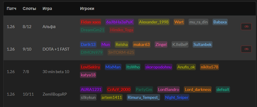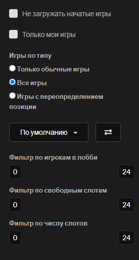 Список игр тоже претерпел изменения. Были добавлены фильтры, строка быстрого поиска лобби. Вместо патча отображается столбец с ником (ID) создателя лобби.