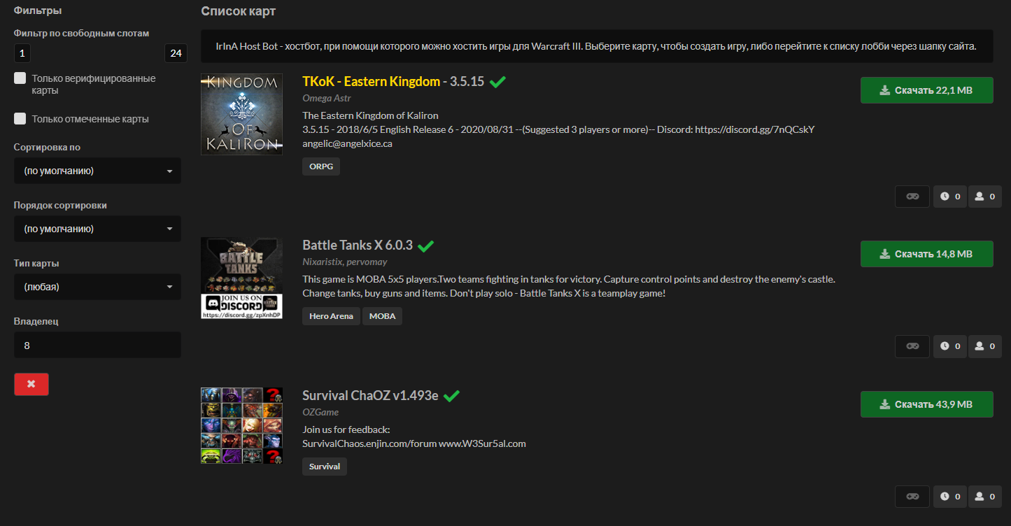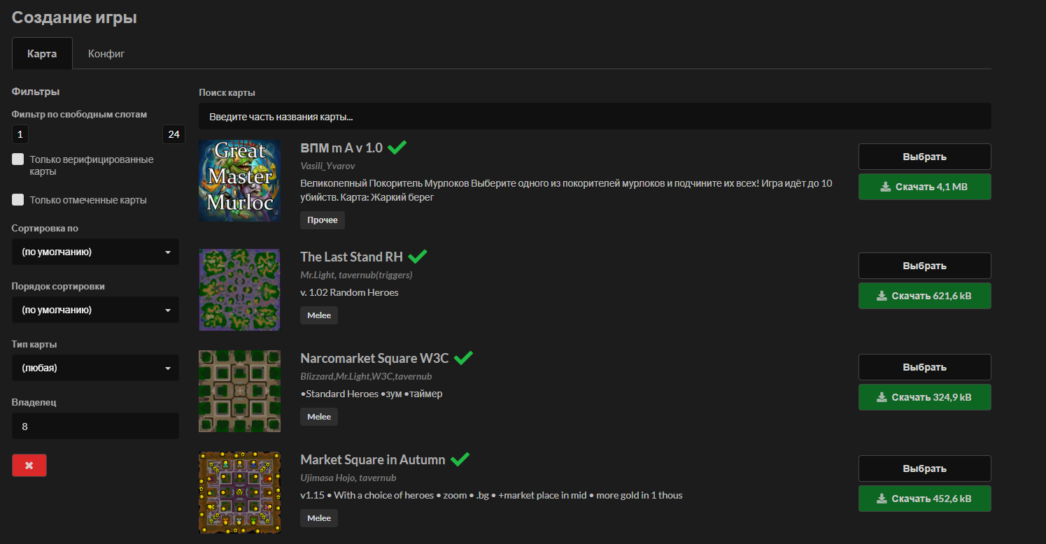 Главная страница сайта теперь является списком карт. По умолчанию там отображаются только верифицированные карты, но фильтрами можно найти любые. Этот список немного отличается от того, что на странице создания игры - если есть открытое лобби можно его отправить в коннектор одним нажатием кнопки ниже описания карты. Так же отображаются счетчики - сколько игроков в игре и в лобби.