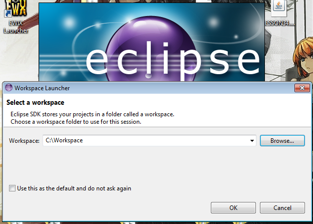 - Шаг 3: Запускаем eclipse.exe и выбираем путь для workspace (папки, в которой будут храниться ваши проекты). Желательно создать отдельную папку, например C:\Workspace