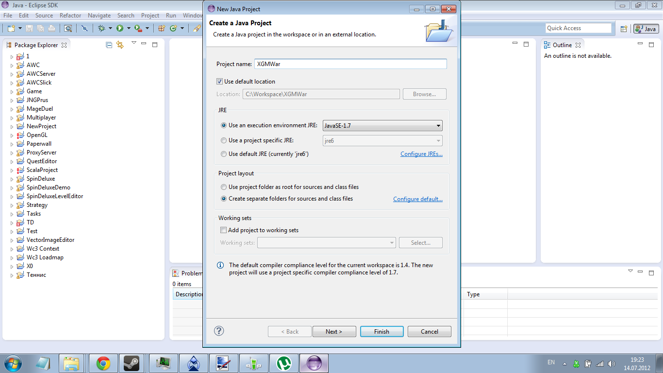 - Шаг 5: Выбираем File -> New -> Java Project. Видим окно с настройками нового проекта, вводим желаемое имя и жмем Finish