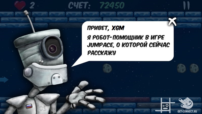 Jumpace это игра жанра аркада. В игре будут представлены 100 игровых уровней. Каждый уровень представляет из себя игровое поле на котором находятся два ряда блоков (сверху/снизу) и игровой персонаж. Персонаж автоматически двигается вверх и вниз, то есть достигая нижнего блока он начинает двигаться вверх, и наоборот. У каждого блока есть своя прочность. Каждый раз ударяясь об блок игрок уменьшает его прочность. При нулевой прочности блок разрушается. Задача игрока разрушить блоки и выбраться с игрового поля. Процесс игры усложняется тем, что периодически по игровому полю пролетают снаряды, которые при столкновение уменьшают жизнь игрока и восстанавливают прочность у блоков. На каждом уровне у игрока имеется определенное кол-во жизней, и при нулевом значение жизни уровень приходиться начинать сначала.