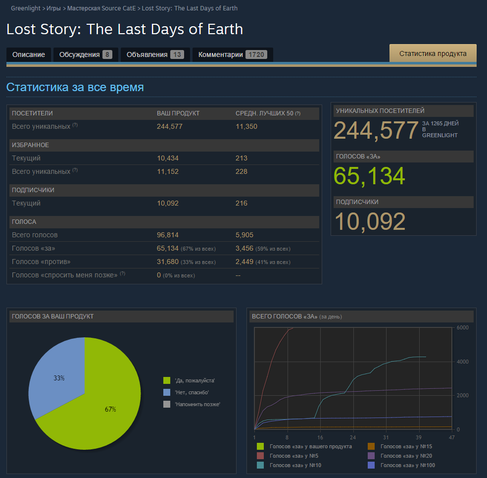 И да, в качестве подарка всем читающим. Хотим впервые публично поделиться статистикой из Steam GreenLight. Уверен, что не каждого проекта будут подобные цифры. (мы ведь так их любим)