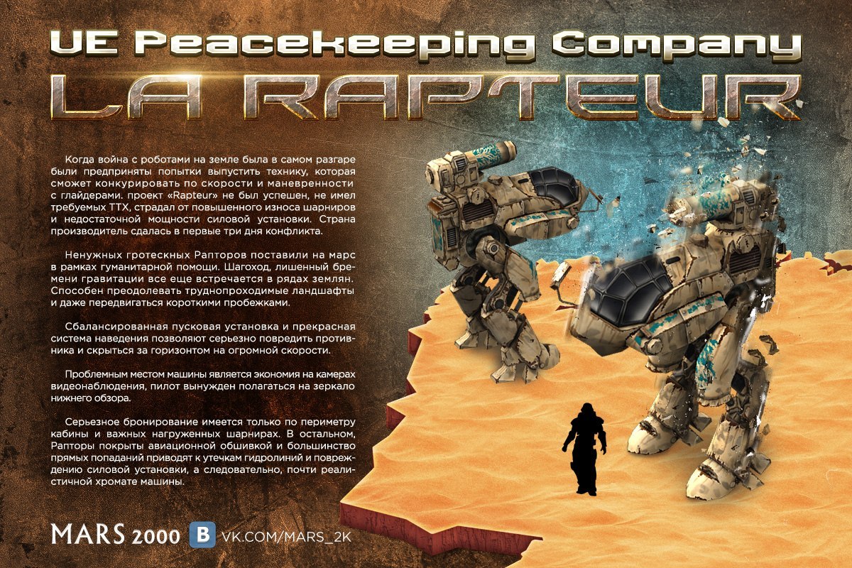 La Rapteur или Раптор. Шагоход, оснащённый однозарядной пусковой установкой, разработанный во Франции. На Земле эту модель тоже сочли неудачной, потому что в условиях земной гравитации шарниры быстро изнашивались, что быстро приводило их в негодность. Но на Марсе эти машины показали себя с хорошей стороны за счёт высокой скорости движения и стрельбы, пусть даже в ущерб броне и огневой мощи. Альтернативный вариант РСЗО.