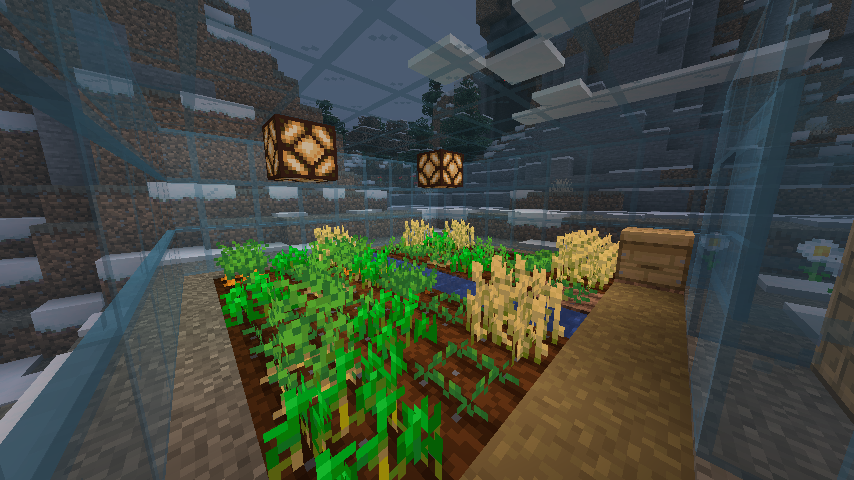 - Несезонные растения могут выращиваться на поверхности в подобие теплицы, если в пределах 16 блоков вверх они накрыты блоками обычного или цветного стекла;