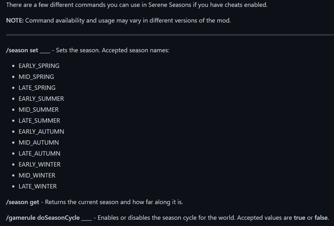 Для умеющих пользоваться командами игроков предусмотрена возможность, включив возможность использования читов в своём мире, прописывать следующие команды, позволяющие изменять текущий сезон, следить за его ходом и сменой периодов, или же полностью отключить смену времён года: