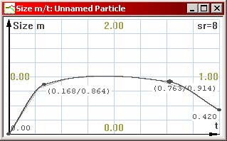 Так как данный график не особо точный, установите частоту дискретизации на 8. Кривая графика указывает на то, что частицы в эффекте стартуют с нулевого размера, затем их размер повышается до полного (1единица) и к концу цикла постепенно становится меньше.