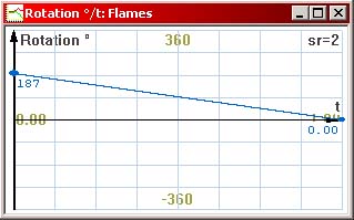 В соответствии с предыдущими графиками, отредактируйте Rotation Multiplier Graph до 0.2 и 0.6 единиц соответственно. В таком случае некоторые языки пламени будут вращаться меньше, некоторые больше. Множитель вращения равный 1 не окажет никакого влияния на график вращения; значения больше чем 1 увеличат вращение, а положительные величины меньше 1 уменьшат его.