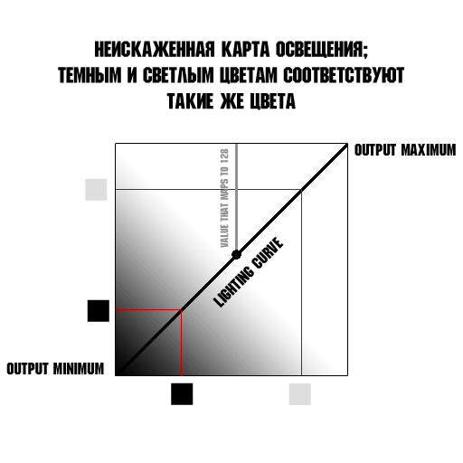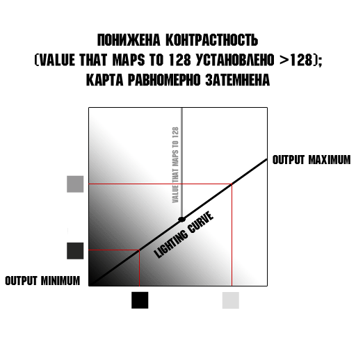 Экспериментируя с Set Lighting Curve, мне удалось установить некоторые закономерности. Рисунки показывают принцип работы этой операции. Нижняя "шкала" – это исходная гамма карты. Левая "шкала" – изменяемая гамма. То есть, если от каждого значения нижней шкалы (по сути, цвета) провести вертикальную линию до пересечения с Lighting Curve, а оттуда горизонтально на левую шкалу, то мы получим цвет, который заменит первый (нижний). Рассмотрим самую очевидную операцию – Вы хотите равномерно затемнить карту. Простое уменьшения параметра Output Maximum не дает желаемого результата – карта тускнеет, но неравномерно, в основном яркие места. Нужно еще увеличить "Value that maps to 128". Это приблизит форму Lighting Curve к прямой – то есть придаст освещению равномерность. Аналогично можно осветлить карту, и даже сделать некое подобие дневнго освещения.