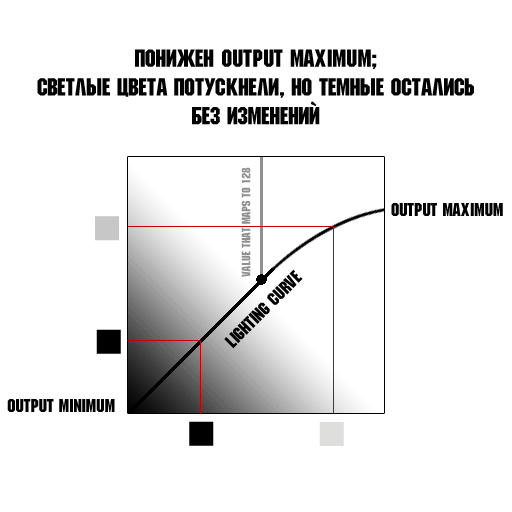Output Minimum (0 - 127) – освещенность черных участков. Если повышать, то даже в тех местах, куда вообще не попадает свет, будет хоть что-то видно.
