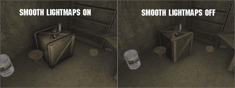 В свойствах Polygroup'ов – Smooth Lightmaps включает сглаживание карт освещения. Полезно для закругленных объектов, для ровных не рекомендуется.