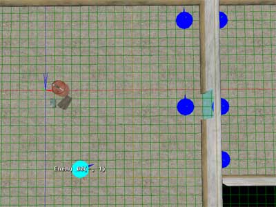 Теперь, когда мы имеем сеть AI-net, мы можем создать первого врага на уровне. Снова разместите сетку на плоскости, в желаемом месте пометите курсор в режиме F3 и нажмите "N". В диалоге "New entity" выберите тип "Enemy". Не имеет значения, если персонаж не находится на дорожке сети AI-Net, пока тот не имеет прямого выхода к узлу AI-node.