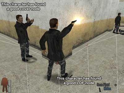 Система AI-system игры Max Payne 2 взаимодействует с окружающей средой через узлы AI-nodes. Например, персонаж AI может определить в реальном времени, находится ли узел AI-nodes поблизости в укрытии от своей цели ("Cover node") или имеётся место для обстрела цели (т.е. имеется Line-Of-Fire - Линия огня, "узел LOF-node").