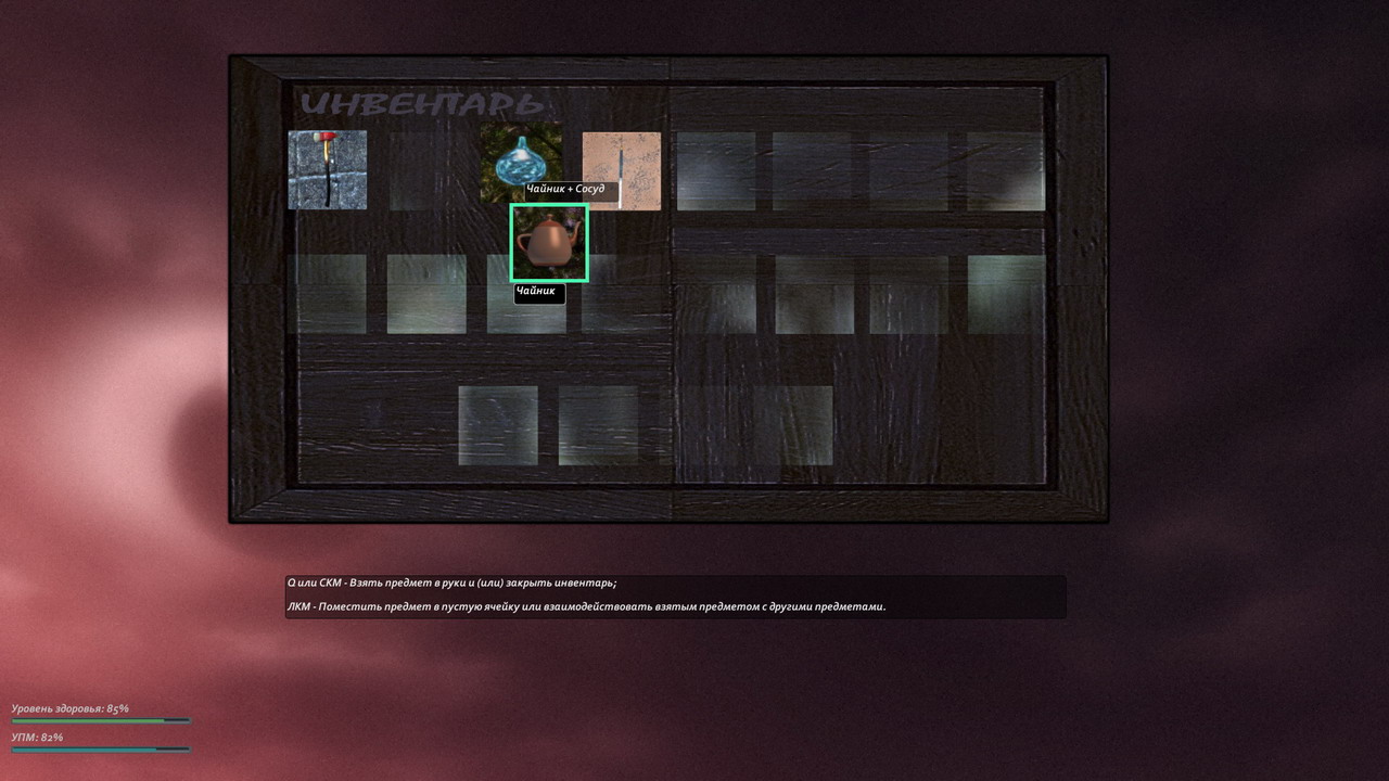 Инвентарь претерпел некоторые изменения и усовершенствования. Теперь добавлять предметы в инвентарь и открывать его можно, используя одну и ту же среднюю кнопку мыши или клавишу “Q” на клавиатуре. Если у вас предмет в руках, то нажав, к примеру, на “Q”, вы кладёте этот предмет в инвентарь, потом на эту же кнопку открываете инвентарь. Кроме того, в самом инвентаре, появилась возможность перекладывать любой предмет из одной ячейки в другую. А также можно осуществлять взаимодействие некоторых предметов внутри самого инвентаря, не выходя из него. Например, внутри инвентаря можно налить чай из чайника в сосуд.