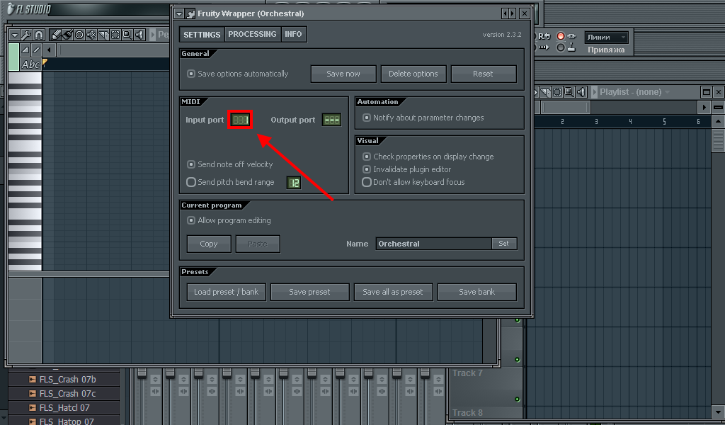 Теперь нам надо связать Dashboard и Orchestral, для этого жмакаем шестерёнку на плагине Orchestral и ищем там input port. Нашли?