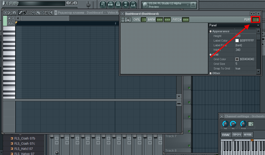 А теперь в плагине Dashboard в правом верхнем углу ищем port. Увидели? Тоже ставим единичку. Пам-парарам! Дело сделано. Вы могли заметить, что там ещё есть такая позиция, как CHNL. Изменяя её значение, мы привязываем копию Dashboard к тому каналу плагина Orchestral, номер которого указан в значении CHNL. Тем же способом мы обычно привязываем в общей сложности 16 копий Dashboard к плагину Orchestral (по одной копии для каждого канала).
