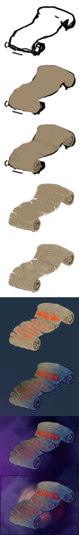 под конец уже рисуешь руны (у тебя они как будто вырезаны/выгравированы там, надо их делать более выцветшими); т.к. я торопился, то руны быстро накидал и сделал Outer Glow, в другом случае можно было бы на ними тоже детальнее поработать (базовый цвет - тень - свет) :)