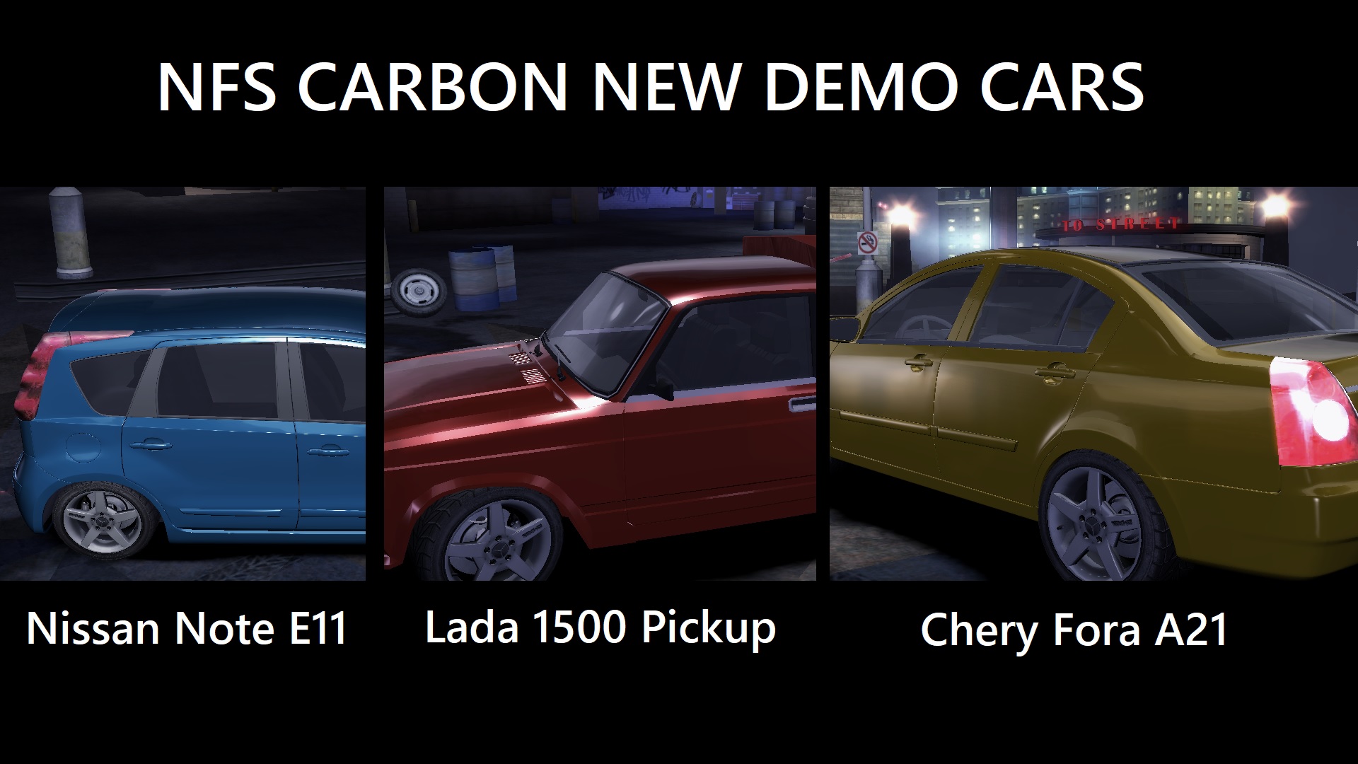 Теперь вы будете ездить на Nissan Note, Chery Fora и ВАЗ 21043-33 в демо-версии NFS Carbon. Эти автомобили отлично встанут и на полную версию игры, на замену Chevrolet Camaro SS, Lamborghini Gallardo и Mitsubishi Lancer Evo IX соответственно.